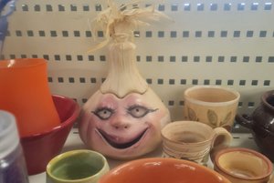 Cedric: Nach der Schule sind Jana und ich dann noch in ein paar Second-hand Läden, dort war das Zeug mal teilweise nicht so teuer. Es gab dort wirklich eine ganze Bandbreite an verschiedenen Gegenständen von Kleidern bis hin zu einer alten VHS von Shrek. Ergattern konnte auf jeden Fall Cedric etwas, naja… unfreiwillig. Die Entscheidung aus Spaß eine hässliche angsteinflößende Zwiebel/Knoblauchbox zu fotografieren und die Familie nach dem Bedarf einer solchen zu befragen ging nach hinten los - sie wollten das grässliche Ding, naja immerhin hat es nur 2 Euro gekostet…