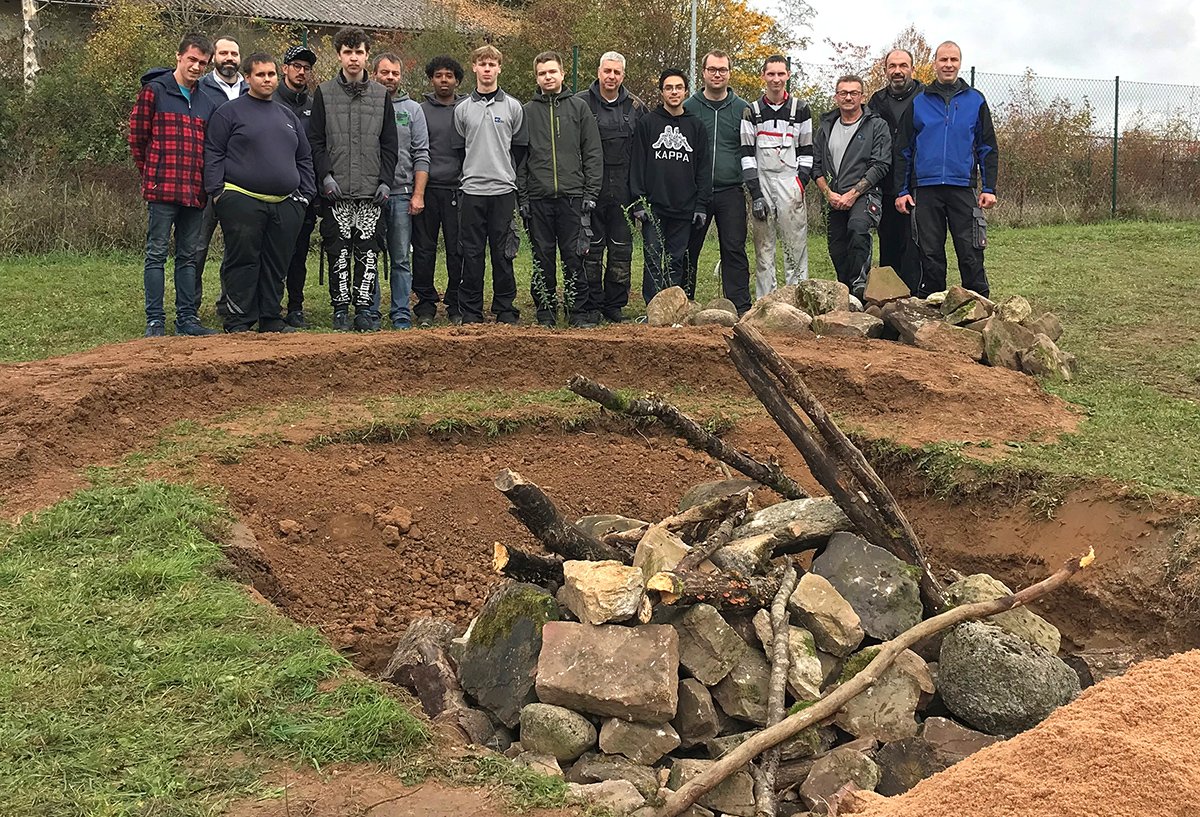 Von Seiten der Buchener Werkstätten waren vor allem junge Menschen aus dem Berufsbildungsbereich beteiligt. Sie hatten zusammen mit Mitarbeitenden der Johannes-Diakonie die nötigen großen Steine besorgt. Die Auszubildenden von Scheuermann + Heilig unter Leitung von Ausbilder Jochen Schnörr, Bojan Gjergjek (Facility Management) und Andreas Ehrenfried (Umweltbeauftragter) brachten weiteres Baumaterial sowie die nötige Bepflanzung mit. Ebenfalls mit im Projektteam: die Firma Henn GmbH, die eine Grube baggerte. Diese dient als Kälteschutz sowie als Tränke und Ort der Eiablage.