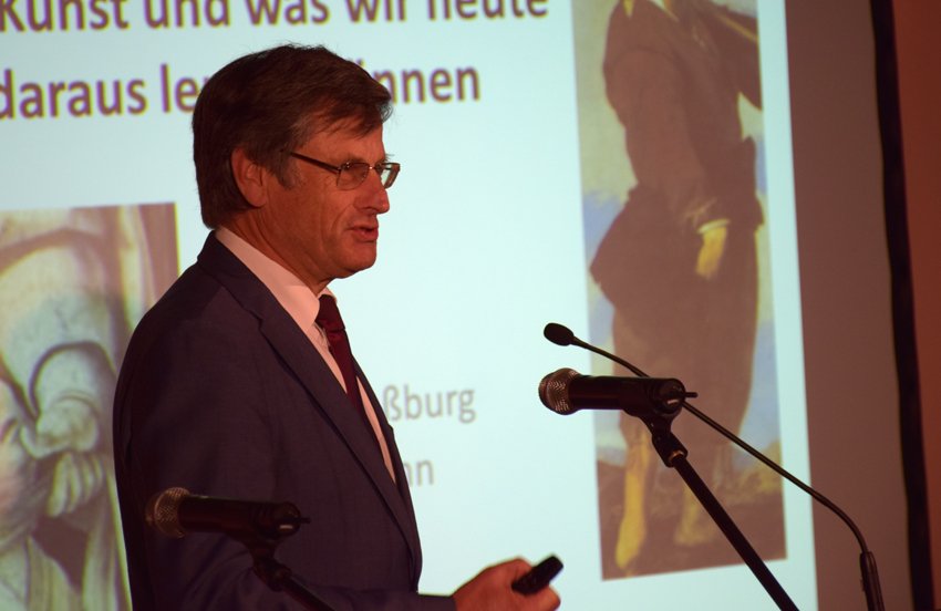 Welche großen Fortschritte in der Behandlung und Förderung von Kindern mit Behinderung nicht zuletzt durch die Arbeit des Kinderzentrums erreicht wurden, machte der ehemalige Präsident der Deutschen Gesellschaft für Sozialpädiatrie, Prof. Dr. Hans Michael Straßburg, in einem Bildvortrag anschaulich. Die musikalische Begleitung für diesen Programmteil boten Emma und Franziska Kniel (Gesang) und Martin Daab (Klavier) von der Musikschule Mosbach. Am Beispiel von Kunstwerken quer durch die Menschheitsgeschichte nahm Straßburg sein Publikum mit in eine Zeit, als Kinder mit Behinderung als Teufelsbälger verfemt und sogar getötet wurden.