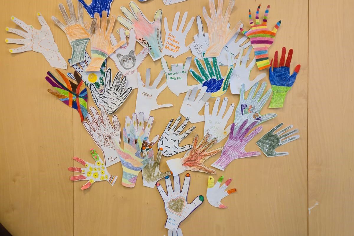 Jana und Julia haben in der Turnhalle mit 21 Schülern Werwolf gespielt und hatten Petter und Lotta als Assistenten dabei. Zuvor haben alle Kinder einen Abdruck von ihrer Hand abgemalt und diesen anschließend nach Belieben ausgemalt. Am Ende des Programms wurden die Flachswickel zum Mittagessen serviert und die ausgeschnittenen Handabdrücke in der Cafeteria an die Wand geklebt. Zu den Flachswickeln haben wir noch unsere Gastgeschenke an die Kinder verteilt, worüber sie sich sehr gefreut haben. Zum Schluss stand noch die Verabschiedung von den Lehrkräften an. Wir bekamen zum Abschied Schokolade und ein kleines Andenken an die Schule sowie Sweatjacken mit dem Optima-Logo. Auch wir hatten kleine Geschenke mitgebracht, die wir dem Team überreichten. Wir bedankten uns für die tolle und lehrreiche Zeit und die vielen schönen Erinnerungen. Danach ging es für uns nach Hause – ans Packen. Am Abend haben wir noch Pläne für das Wochenende in Helsinki gemacht.