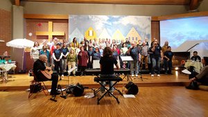 Das Publikum in der Johanneskirche wurde nicht nur vom Ensemble, sondern auch vom Bühnenbild (Karin Manschadi) in die Geschichte hineingezogen. Voll motiviert, mit bunten Tüchern und dem Song „Regenbogenfarben“ von Kerstin Ott eröffneten die beteiligten Chöre das Musical. „Memories“ von „Maroon5“ wurde von Ute und Annika Zimmermann mit Orffschem Stabspiel begleitet. Auch das Lied „Engel“ von Marius Müller-Westernhagen durfte nicht fehlen. Manche Ensemble-Mitglieder konnten in Solostücken brillieren, so etwa Diana Israel im Lied „Seite an Seite“ von Christina Stürmer. Spätestens beim südamerikanischen Lied „Un Poquito Cantas“ waren die Zuschauerinnen und Zuschauer voll dabei, klatschten laut mit, und viele packte die Lust mitzutanzen. Der Erfolg war hier schon perfekt.