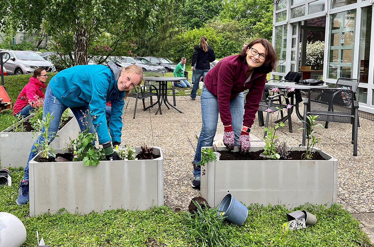 An anderer Stelle ging es handfest mit Kelle, Spaten und Akkuschrauber zur Sache: Die Rhein-Neckar-Werkstätten hatten zwölf SAP-Mitarbeitende aus Buchhaltung und Wirtschaftsprüfung zu Gast. Für einen Tag arbeiteten diese freiwillig als Landschaftsgärtner. Nach der Begrüßung durch den Werkstatt-Leiter Jan Esterle und die Ehrenamtskoordinatorin der Johannes-Diakonie, Tanja Bauer, legten sie einen Weg und einen Sitzbereich im Hof der Werkstätten an. Außerdem bauten und bepflanzten sie Hochbeete. Von der schlechten Wetterprognose ließen sie sich nicht abschrecken und konnten schließlich als erste die neu erstellte Pausenfläche einweihen. Nach bereits mehreren Einsätzen in der Johannes-Diakonie zeigte sich SAP-Teamkoordinatorin Dr. Sonja Müller auch dieses Mal zufrieden darüber, dass „wir Johannes-Diakonie-Mitarbeitende wie auch Klienten und Klientinnen der Rhein-Neckar-Werkstätten nachhaltig unterstützen und ihnen viel Freude bereiten konnten.“