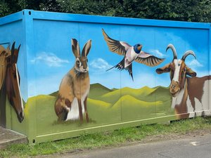 Schwarzach. Die Outdoorklasse der Schwarzbach Schule hat ein naturnahes Sprayprojekt umgesetzt. Der Toilettenwagen auf dem Gelände der Jugendfarm wurde von Schülerinnen und Schülern zusammen mit dem Sprayer Philipp Himmel neu gestaltet. Zuerst musste der Container abgeschliffen und grundiert werden. Dann wurden die Bilder mit einer besonderen Technik auf dem Container erst skizziert und dann ausgemalt und ausgearbeitet. Bei den Motiven stand die tierische Nachbarschaft Pate. Nun schmücken lebensecht gestaltete Porträts von Pferd, Hase, Ziegen & Co das mobile Klo.